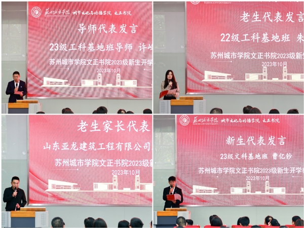 导师代表许峰川对同学们提出三点期待:一是希望同学们把握机会,充分利用学校提供的优质资源,在夯实专业知识的基础上,积极修读多领域拓展课程,踊跃参与各类科技活动与竞赛,开拓视野,提升能力;二是希望同学们激流勇进,选择做难事,为向上生长储备基本能力;三是希望同学们不断向上,获得自由。老生代表朱雅琪回顾了自己过去一年在书院的求学经历,她希望学弟学妹们能够在四年的学习生活中做到确立目标、脚踏实地,培养能力、锻炼自我,劳逸结合、全面发展。老生家长代表倪留平先生上台发言。他表示,文正书院是一个高水准平台,能为学生提供非常多的优秀资源和锻炼机会,他代表书院学生的家长感谢所有老师的悉心教导与培养,同时也祝愿新一届的书院学子能取得更加优异的成绩。新生代表曹亿钞同学表示,新一届书院班将秉承书院“知文正行”的院训,以高度的学习热情,扎实稳重的学习态度,乐观向上的生活心态,高昂的精神面貌,在知识的曙光下追赶时代的光辉,争做学识的强者。
