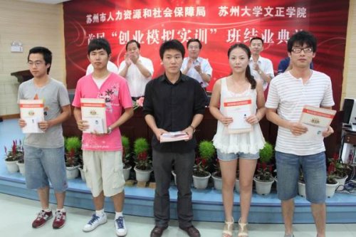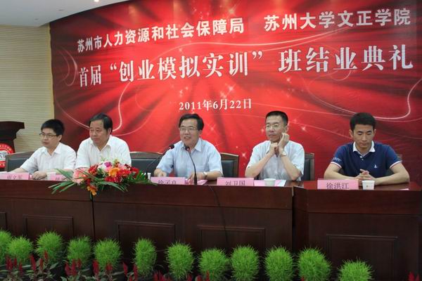作为苏州市首家建站单位,苏州市人力资源与社会保障局、苏州大学文正学院以及全球模拟公司联合体中国中心十分重视在文正学院开设的首期创业模拟实训,经过两个多月的紧张学习、培训,学员圆满完成学习、实训任务。6月22日下午,苏州市人力资源与社会保障局在苏州大学文正学院隆重举行首期《创业模拟实训》班结业典礼。文正学院常务副院长徐子良、苏州市大中专毕业生就业指导中心主任刘卫国、苏州市劳动就业管理服务中心副主任钱平原等领导参加了结业典礼。