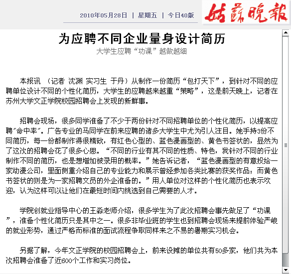本报讯(记者沈渊实习生于丹)从制作一份简历“包打天下”,到针对不同的应聘单位设计不同的个性化简历,大学生的应聘越来越重“策略”,这是前天晚上,记者在苏州大学文正学院校园招聘会上发现的新鲜事。