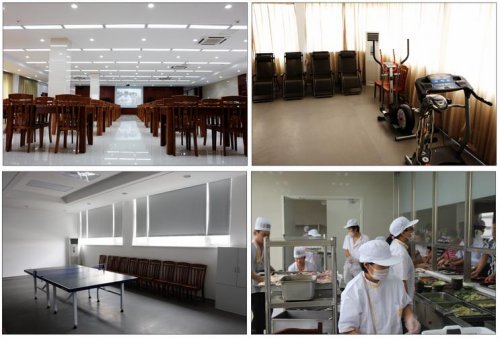 宽敞明亮的教师餐厅不仅可以容纳近200人同时就餐,它还兼具午间休息、运动健身、休闲交流等众多功能。这里专门辟出两个房间作为男、女老师的休息间,休息间里配备了可自由调节位置的多功能躺椅;专门辟出一个房间作为健身房,针对不同老师的不同需要配备了踏步机和跑步机;专门辟出一个房间作为乒乓室,有兴趣的老师可以在这里捉对厮杀几局之后再投入到紧张的教学中去。至于开放式的教师休闲吧,在当天午间就吸引了众多老师前来体验。他们喝着免费咖啡或者茶水,或三两交流,或看书读报,都乐在其中。为了便于他们查找资料、整理教案,这里还实现了无线网络全覆盖。