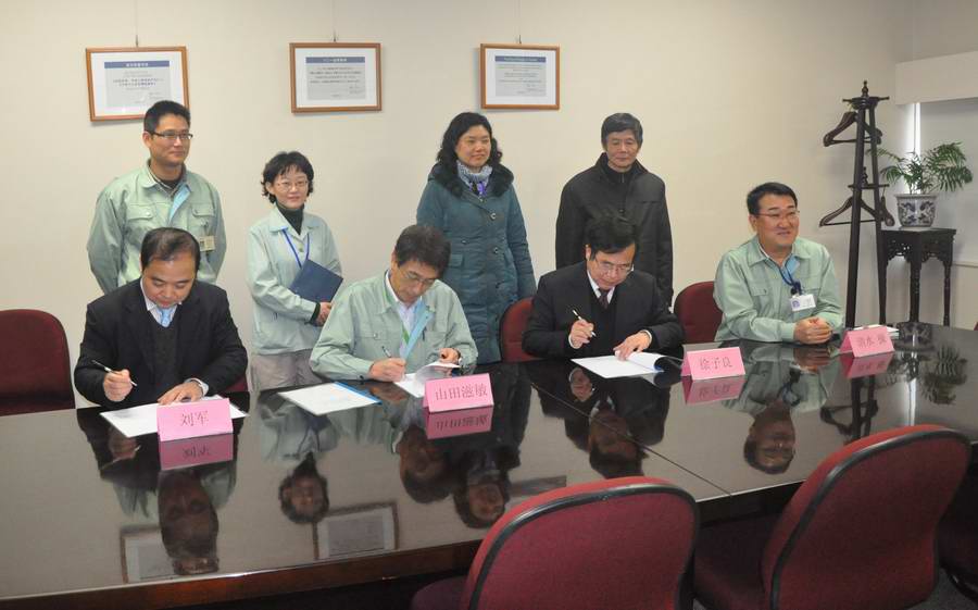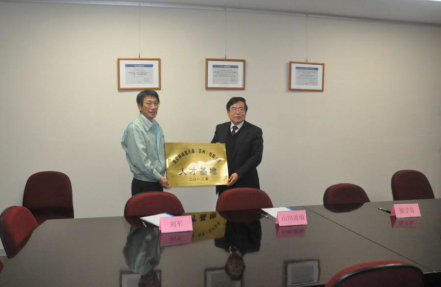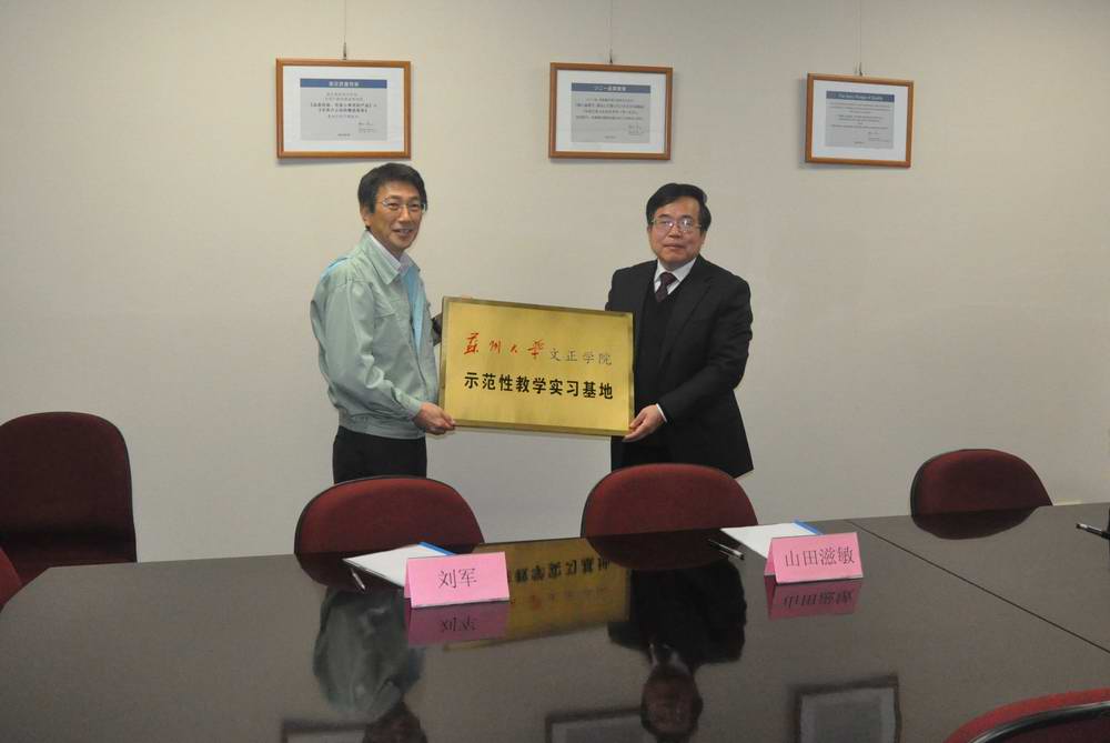徐子良先生与山田滋敏先生在合作共建学生实践教学基地协议上签字,并共同为文正学院示范性教学实习基地和索尼移动显示器(苏州)有限公司人才基地揭牌。