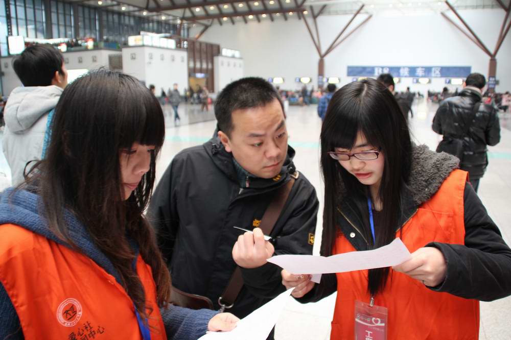 闫易、许颖两位同学是苏州大学文正学院国贸专业一年级的学生。他们今天的角色是该学院在苏州火车站设立的爱心服务岗志愿者。这个爱心服务岗自2008年成立以来,坚持每个星期的星期六、星期天都有至少六名同学前来提供志愿服务,遇到节假日还会增加人手。除了这个爱心服务岗之外,他们还在火车站附近的公交站台为下了火车的旅客提供导乘服务。这些同学都是文正学院学生社团爱心社的成员,他们身上穿着的桔红色志愿者马甲,已经成为火车站一道充满青春活力的流动风景线。