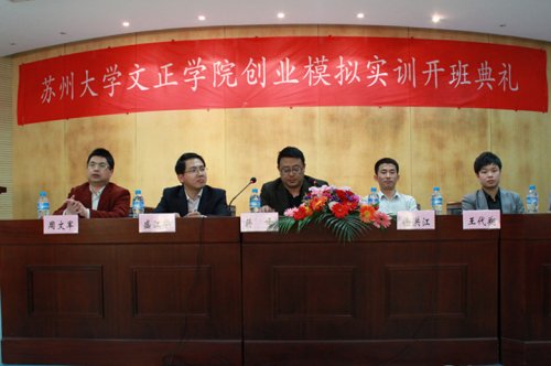 王代翔介绍了“创业模拟实训”在中国的发展和培训特色。蒋峰在讲话中指出,第三期“创业模拟实训”的开班,标志着我院与苏州市人力资源与社会保障局、全球创业模拟实训苏州中心的合作共建已经取得了显著成效,也标志着我院对大学生创业教育工作正沿着科学化、规范化的道路在良性发展!他代表学院领导和全体师生对苏州市人力资源和社会保障局、全球创业模拟实训苏州中心的大力支持表示衷心的感谢!他希望三方不断总结办班的成功经验,争取一期比一期办的更好;希望参加培训的学员珍惜来之不易的学习机会,充分发挥主观能动性,重视创业模拟实训,带着问题学习,不断培养自己的创新能力和创业水平。