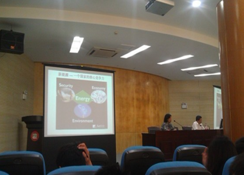 为了让大家更清楚、更形象地了解作为国家核心竞争力的新能源,沈教授从“为什么要发展新能源”、“新能源技术”以及“新能源的现状与趋势”三方面展开此次讲座。沈教授首先从中国的实际发展状况出发,简明扼要地指出我国现在所面临着的能源利用率低的严峻问题,强调了探索、发展新能源的必要性与重要性。接着,沈教授具体介绍了现在新能源技术的发展情况,使大家充分了解到新能源的一些基本概念与技术:新能源通常指太阳能、风能、电能、海洋能、生物质能等,目前我国在新能源尤其在太阳能光伏生产上已经进入世界前列,因此,新能源产业已经成为国家新兴产业振兴计划中的重要内容。最后,沈教授强调,为顺应国家新能源发展战略,特别是光伏行业高速发展的形势,更好地服务地方经济,全面提升国家核心竞争力,我们需要培养更多新能源技术研究方面的人才,去发现、研究并充分利用新能源技术。