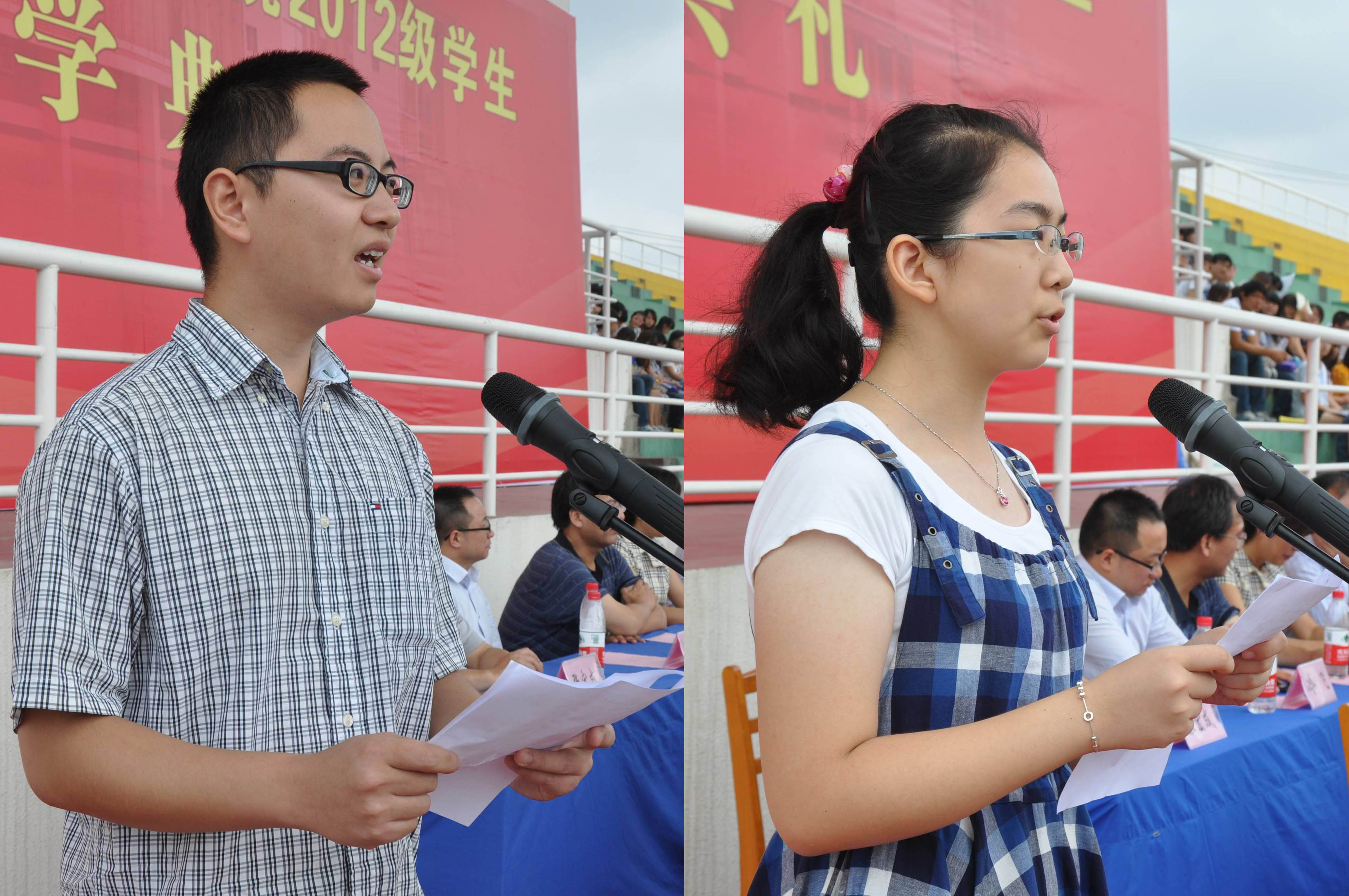 我院2009级微电子专业学生石润彬作为老生代表发言,2012级法学专业学生樊尧璇作为新生代表发言。