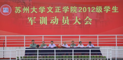 9月2日下午,我院2012级学生军训动员大会在运动场隆重举行。出席此次动员大会的有:驻苏73049部队工兵营营长、军训团副团长吴克强少校,苏州大学党委副书记、副校长江涌教授,苏州大学人武部部长、军训团政委邓国林同志,以及我院院长殷爱荪教授、常务副院长徐子良同志、党委书记吴昌政同志。动员大会由苏州大学学生工作部(处)副部(处)长、军训团教导员董召勤同志主持。