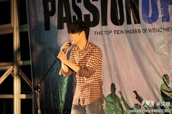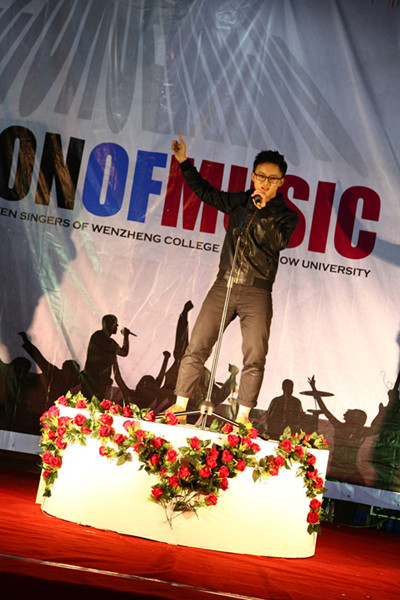 在这个有丝丝凉意的秋夜,选手们用自己充满热情的表演为在场观众驱散寒冷。2012级金融学专业的陈子雷同学凭借自己极具穿透力的嗓音,闯入决赛。他用自己精心设计的一个纯白色开满玫瑰的圆形舞台吸引了观众的眼球,再加上他极佳的唱功和超强的互动能力,以一首《最美的太阳》征服了在场的每一位观众。