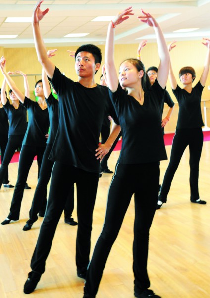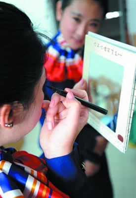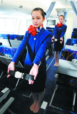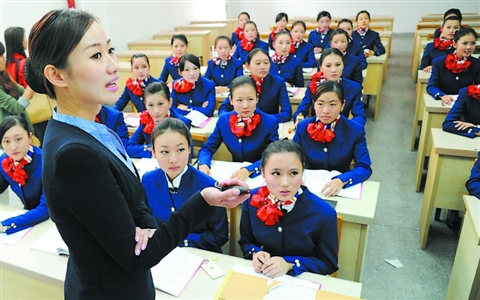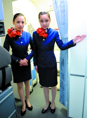周一有制服礼仪课,因为要“隆重”地梳妆打扮,女生王梦华和顾辰璐觉得有点“麻烦”,“化妆起码要花半小时呢,头发不能毛,不能有留海。”修身的圆领短小衣和窄窄的膝裙,亮红的领巾,在颈边系出盛开的花朵;画眼线、刷睫毛膏,大眼睛扑闪扑闪的……两个大一新生,身姿优雅大方,笑容甜美,已经相当具有“空姐”范儿了。不过,这漂亮也有代价,“像我们俩,1米65,体重不能超过50公斤,吃东西要克制,零食不能碰,老师还会定期检查我们的饮食。”王梦华说。“以前只是向往,进入这个专业才发现并不轻松,”顾辰璐说最“痛苦”的是每天六点一过就要起床,六点三刻到七点半是铁打不动的早锻炼时间,天天要长跑。确实,空乘专业学生的表面光鲜之后,辛苦付出少不了:除了体力要求,形体课上,他们通过芭蕾、游泳、走秀等内容形式来矫正身姿,锻炼身体部分肌肉;普通话、外语要求都非常高;还有各种文化素质课。九月开学,艺术中心里还多了一个专业的模拟客舱,结合了波音737-800和空客A320两种机型的规模和配置,舱门入口、座位、行李架、救生用品、食物操作台等与真实的客机一样,学生要在这里进行实境学习和训练……总之,全力以赴,希望努力做到完美。