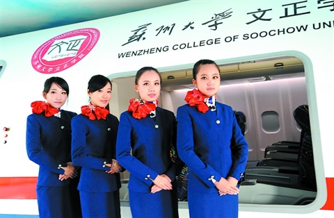 首席记者沈渊 摄影建中 对于苏州大学文正学院的师生来说,新学期最新鲜亮眼的,莫过于校园里多了身着“宝石蓝”空乘制服的“空姐”、“空哥”。身材高、回头率高、就业率高———这群“三高”美女帅哥,是文正首届空乘专业的学生。文正也因此成为省内除南航以外,首开空乘本科专业的综合性高校。