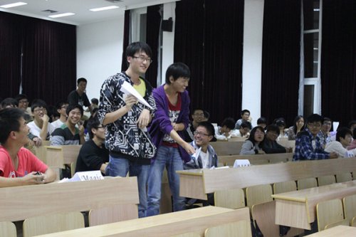 接着,主持人详细地解释了每轮比赛的规则。随着PPT的播放,参赛选手开始答题。比赛共分为五个环节,即6进5,5进3,3进2,复活赛和决赛。别具一格的是比赛抢答方式——折纸飞机。主持人一声“抢答”后,各队员便争先扔出各自折叠的纸飞机,开始抢答,场面甚是激烈。