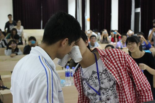 每两轮比赛间歇时的互动环节,如趣味问答、铁人三项、水杯递水等,使参赛者情绪不断高涨,特别是“水杯递水”游戏,将现场氛围推到了顶点。