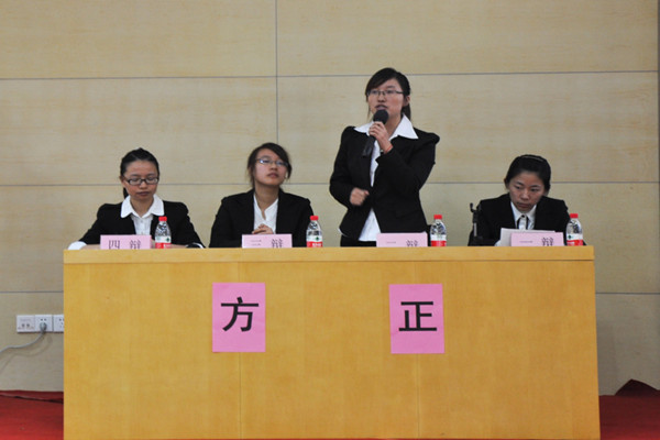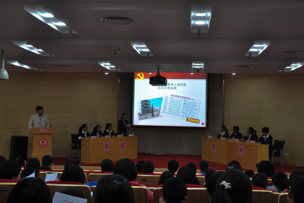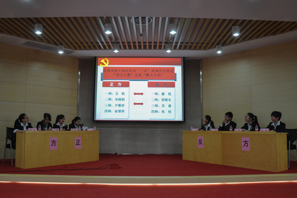 在友新街道党工委副书记余赫香的一番精彩致词后,表演赛正式开始。文正辩论社八名优秀辩手针对辩题“我国房屋土地征收对三农政策的发展是利大于弊还是弊大于利”展开了激烈的辩论。在随后的自由辩论环节中,面对反方辩手们精辟的措辞,正方辩手们毫不示弱地通过现场展示图片资料的方式多角度论证己方观点,现场气氛迅速升温,进入白热化阶段。