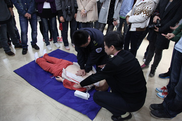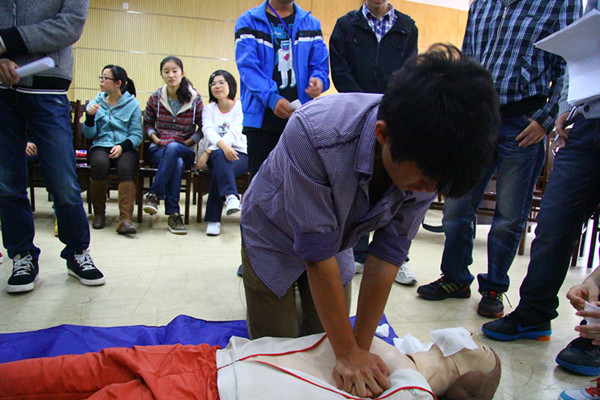 讲座之后便是激烈的实践对决。活动成员共分为六组,每组取两名成员比赛,比赛内容主要是考察同学们对心肺复苏知识的理解和正确运用。“我会将这些急救知识牢牢记住,帮助自己,也帮助他人”,比赛中表现优异的学生会文娱部范静娴同学说。赛后,急救中心的工作人员也对同学们的表现赞不绝口,并希望以后能经常合作,将更多的急救知识带给大家,让大家学以致用,利人利己。