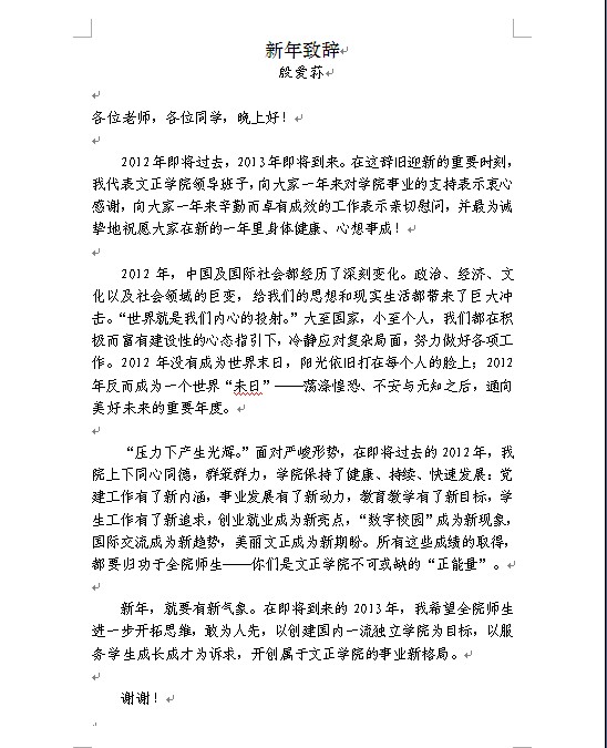2012年即将过去,2013年即将到来。在这辞旧迎新的重要时刻,我代表文正学院领导班子,向大家一年来对学院事业的支持表示衷心感谢,向大家一年来辛勤而卓有成效的工作表示亲切慰问,并最为诚挚地祝愿大家在新的一年里身体健康、心想事成!