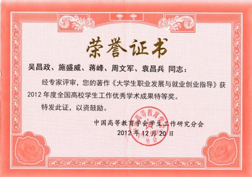 此次成果评选是根据《中国高等教育学会学生工作研究分会关于评选2012年度全国高校学生工作优秀学术成果的通知》(学研会[2012]4号)精神,经个人申报,由中国高等教育学会学生工作研究分会组织专家进行评审。本次共评出2012年全国高校学生优秀学术成果361项,其中特等奖10项,一等奖81项,二等奖270项。我院申报的《大学生职业发展与就业创业指导》成果,系由吴昌政任主编,施盛威、蒋峰任副主编,徐子良、袁昌兵、周文军、卞海勇、王淼、周建军和宋丹任编委共同编写的教材,该教材由《现代教育出版社》于2012年9月出版,著名创业教育专家李家华教授担任顾问。