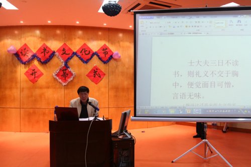 陈桂声教授的“大学生与读书”主题讲座将活动的气氛推向了高潮。陈教授就为何读书与如何读书两个话题发表了自己独到的见解。他认为,物质财富是一时的富有,而由读书带来的气质与素养才是伴随一生的精神财富。“现代人忙忙碌碌,无所事事,但是读书使人充实。也许人的一生无法做成惊天动地的大事,但可以做一个有修养的人,安宁地过一生。”陈教授寓庄于谐的话语博得同学们阵阵笑声的同时,也带给大家对当前社会以及自身的深思。