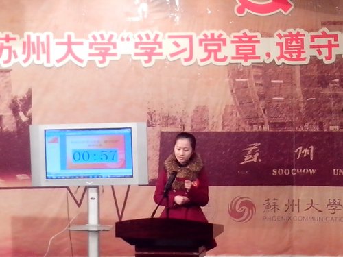 3月27日下午,苏州大学“学习党章,遵守党章”主题演讲比赛在独墅湖校区凤凰传媒学院演播厅隆重举行。来自全校7个校区22个学院的师生共36人参加了比赛。我院2010级劳动与社会保障专业唐欣韵同学以其自信的风范、刚柔并济的演讲打动了现场观众,荣获本次比赛二等奖。