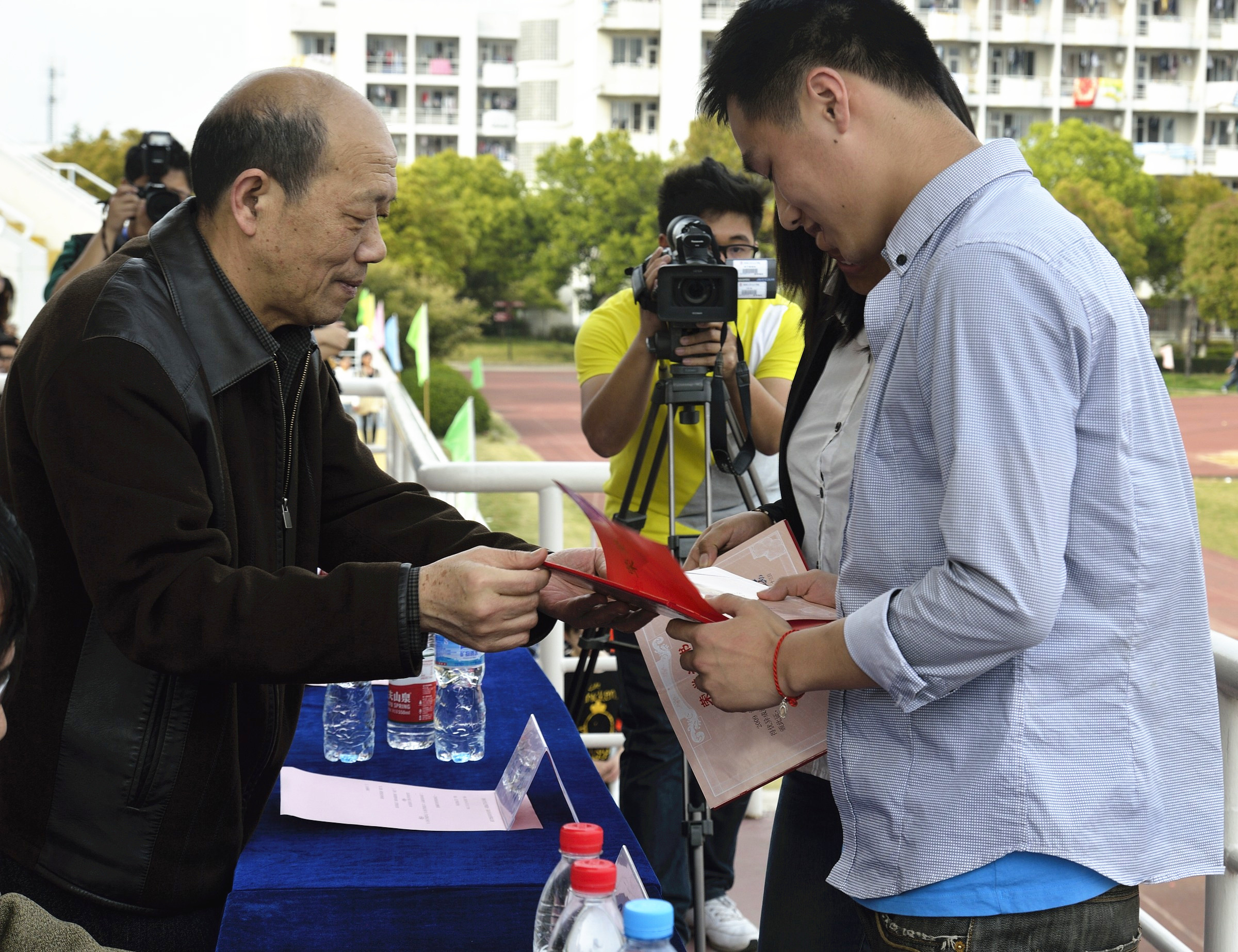 2009级通信工程专业的李旭同学以及2009级新闻专业的刘燕同学因代表学院在各项体育赛事中成绩优异、贡献突出,荣获院长特别奖。院长殷爱荪为他们颁发奖状。