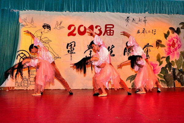 无论是合唱团开场慷慨激昂的《红旗飘飘》,还是舞蹈团呈现的一支支唯美飘逸的舞蹈,又或是艺术团民乐团典雅古朴的《国乐飞扬》,学生会艺术团的团员们用精彩绝伦的演出向毕业生们的青春致敬。诗歌朗诵《我们的四年》,在低缓钢琴声的伴奏下,朗诵者边朗诵边从入口处徐徐走向舞台,细数大学四年中难忘的点点滴滴,在座观众不胜唏嘘。如果说前半场的气氛始终浸润着离别的不舍,那么后半场演员们的精彩演绎则传达着他们的美好祝愿。正如十佳歌手张强所说:“毕业不是离别”,他一上场就以火热的舞蹈和一曲激情四溢的《东区东区》将现场气氛推向高朝。2012级机械工程与自动化专业的男生们带来的创意秀则以独特的想法和夸张的表演赚足了人气,男男走秀、广播体操恶搞、千手观音,8个身着花裤衩的男生或妖娆或卖萌,或扮演大公鸡或猪八戒背媳妇,引得全场爆笑不止。