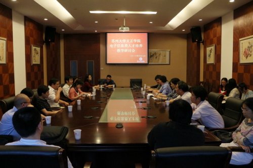 (翠文报记者:芮玉洁/文 贺汀/图)6月7日下午,我院电子信息类人才培养教学研讨会在学生活动中心举行。苏州大学电子信息学院副院长刘学观一行应邀参会,我院副院长施盛威,教务处处长胡荣,实验与实习管理中心主任黄新,以及电子信息系副主任、科研活动指导中心和科技竞赛指导中心主任高志斌等出席会议。本次研讨会由施盛威主持。
