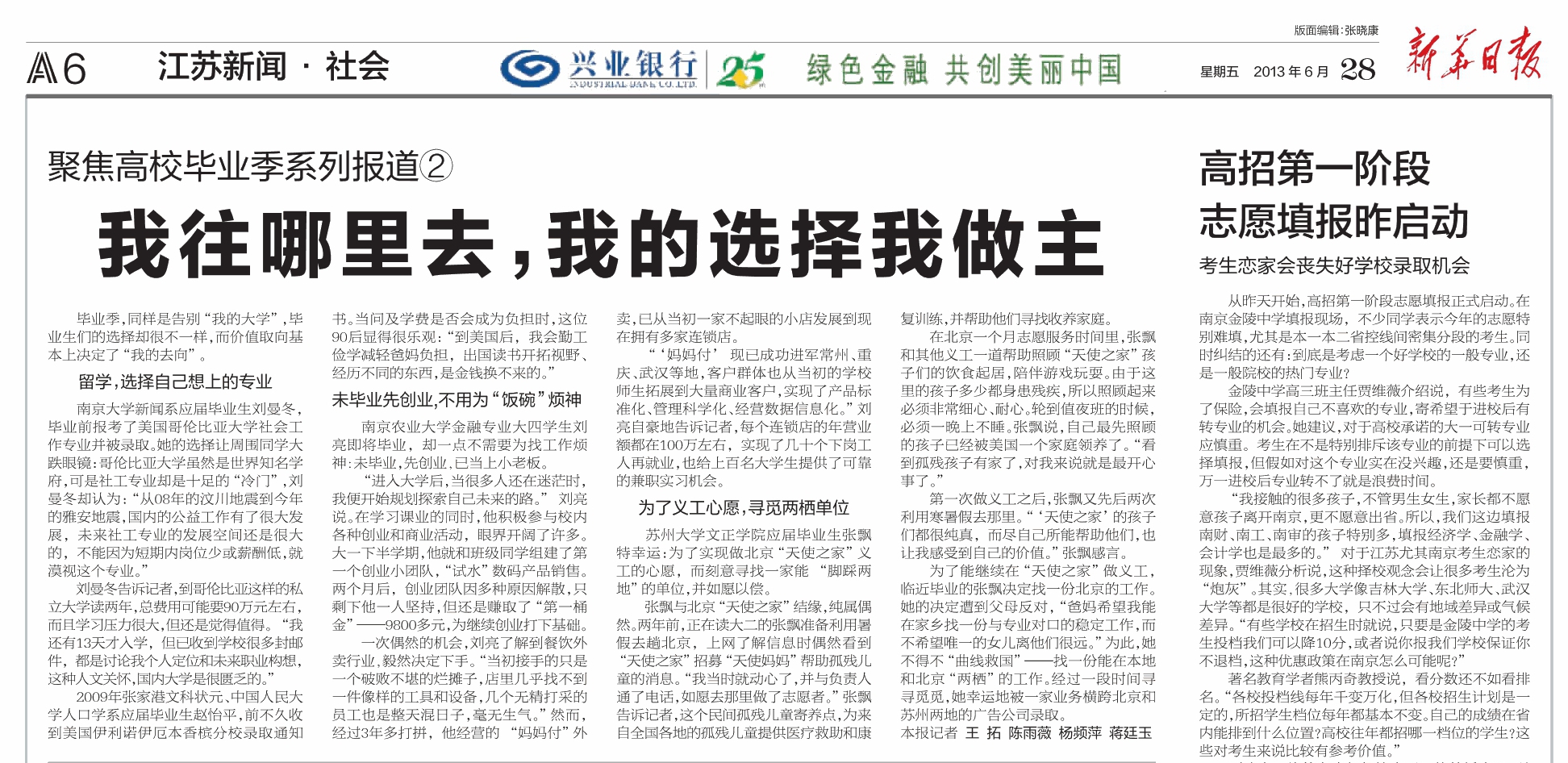 近日,《新华日报》在《聚焦高校毕业季系列报道》中,以《我往哪里去,我的选择我做主》为题,对她与众不同的“择业”事迹进行了重点报道。