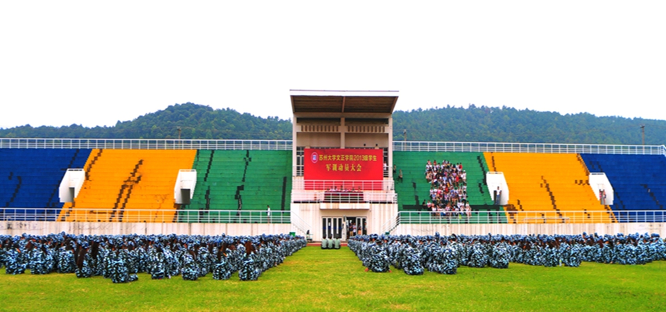 (翠文报记者:贺汀/图)8月27日下午,我院2013级学生军训动员大会在运动场举行。驻苏73049部队工兵营教导员、苏大军训团副团长陈敬峰,苏州大学人武部部长、军训团政委邓国林,以及我院院长殷爱荪、常务副院长吴昌政、副院长施盛威、院长助理袁昌兵等出席动员大会。大会由苏州大学学生工作部(处)部(处)长、军训团政委张国华主持。