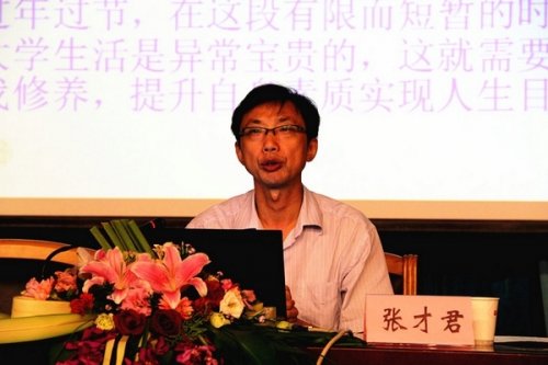 张才君教授的讲座主题是《我的生涯我作主——与大学生朋友谈生涯规划策略》。张老师用详实的数据、生动的语言、经典的案例和庞大的信息深入浅出地阐述了大学生为什么要进行职业生涯规划和如何做好职业生涯规划,并向新生推荐了深圳市鸿儒堂文化传播有限公司董事长覃彪喜的《求职,从大一开始》、《读大学,究竟读什么》和创新工场董事长兼首席执行官李开复的《做最好的自己》、《给中国学生的信》等学习资料。