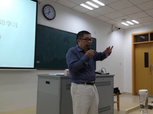(13英语冯笑蕾/文 项晨佳/图)10月14日晚,苏州大学外国语学院徐健老师应邀来到我院,为我院英语爱好者开展英语语言学习讲座。本次讲座的主题为“雅思、托福与英语学习——兼英语专八的准备”,帮助引导英语学习者掌握正确学习英语的方法与技巧。