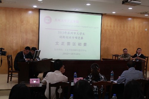 为配合由苏州市人社局组织的“苏州市青年(大学生)创新创业专项竞赛”的全面推进,进一步推动我院大学生创业活动的蓬勃开展,院就业处、创就业指导中心在精心动员组织的基础上,于2013年10月13日上午在学院学生活动中心,成功举办了“2013年苏州市青年(大学生)创新创业专项竞赛(文正赛区)初赛”。