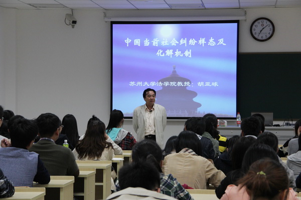 讲座伊始,胡亚球从中国当代形势下的三种和谐谈起,辅之中国现实中的诸多例子,如贪官问题、地沟油事件、毒奶粉事件等等,指出可以从一个侧面将社会纠纷看成是反映当代社会问题及矛盾的良好枢纽,找寻并发挥其作用中积极一面的方法,为社会与人类的进步服务。接着,他从人类纠纷的起源、中国当前疑难社会矛盾、当前中国社会纠纷的化解三个方面,用其幽默诙谐的语言,兼并各种典型的事例,详细阐述了上述三方面的内容。