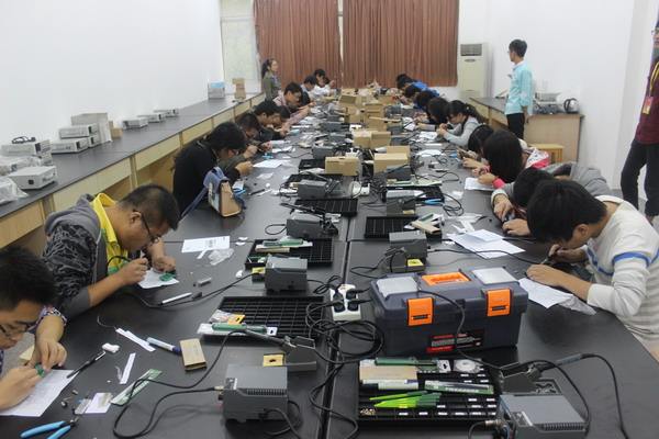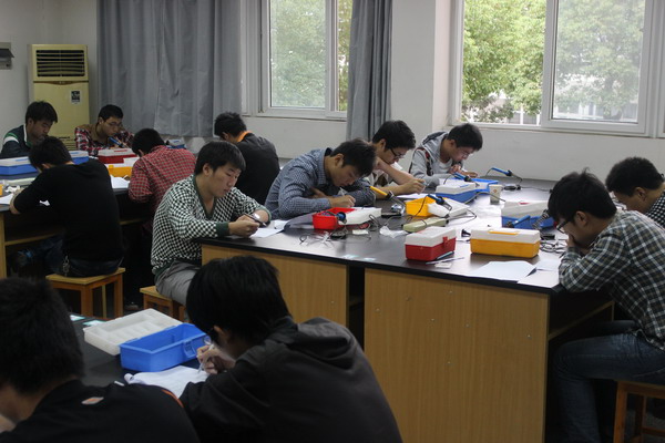 初赛首先进行的是笔试部分,由光电技术系系主任邹丽新老师精心准备的笔试试卷被顺利下发到各个参赛选手的手里面,在一小时的安静氛围中,参赛选手顺利完成了笔试部分的较量,紧接着进行的是电子技术技能大赛的实践部分,200多份的电子元件在工作人员的紧张工作下被逐一发放到参赛选手手里。在宣布安全注意事项后,大赛进入到高潮部分,选手们充分发挥自己的才能,按电路图焊接自己的作品,两小时后选手们大多都收获了自己的惊喜。工作人员也及时为选手的作品贴上标签,集体封存。初赛所有的作品将送到系主任处进行评定。