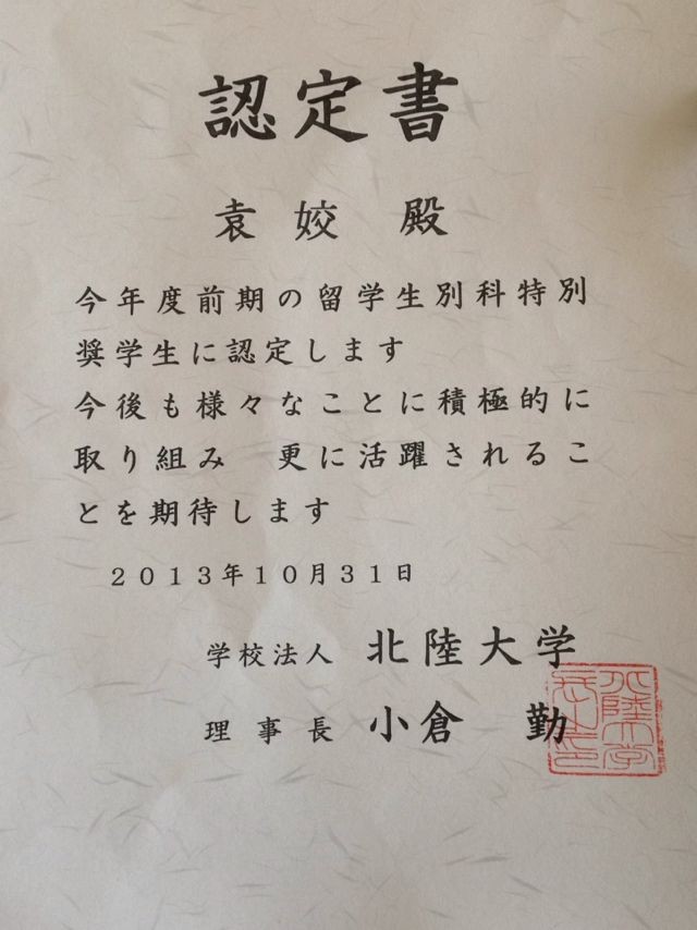 11月7日,我院国际合作交流处收到日本北陆大学发来的奖学金学生认定书。我院2010级日语专业袁姣同学在该校留学期间表现优异,获得“留学生别科特别奖学金”。
