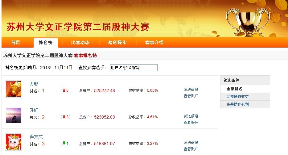 讲座最后,活动主办方向大家公布了模拟炒股大赛第一周的情况,2013级通信工程的万敏同学摘得了第一周的周冠军桂冠。