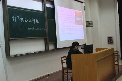 邹刘嘉向大家讲解计算机知识 讲座现场 11月13日下午5:00,由计算科学系团总支、学生分会联合数码空间、信计党支部共同举办的“计算机知识讲座”于教学楼2-101室如期举行。数码空间社长邹刘嘉倾力演讲。 (学生工作处)