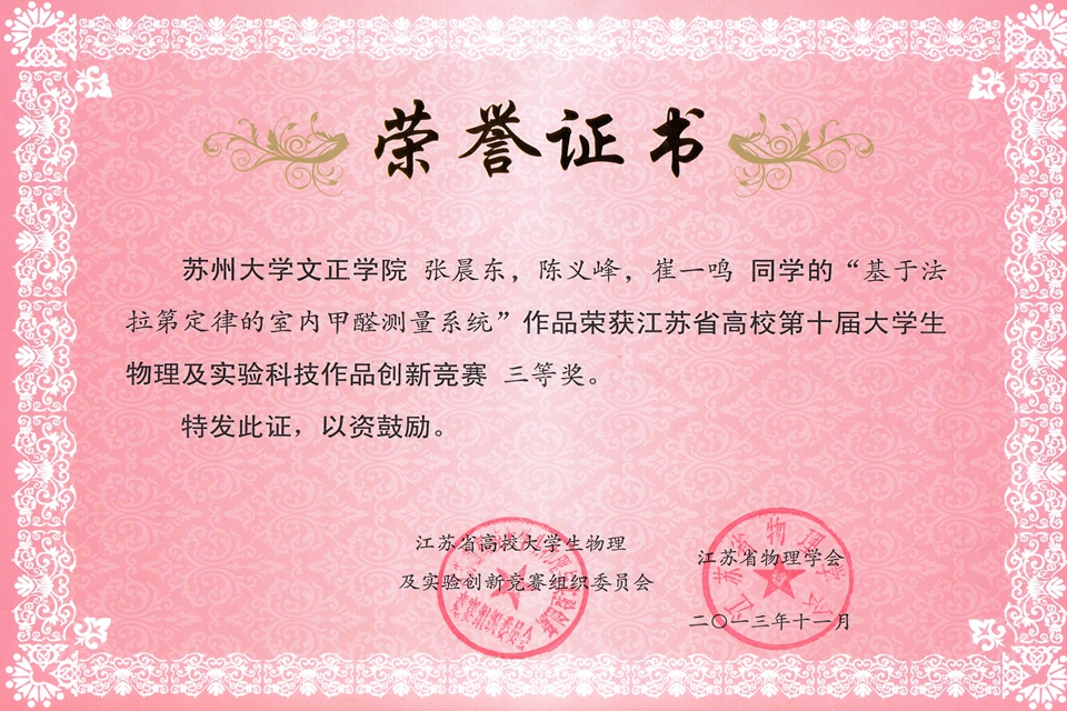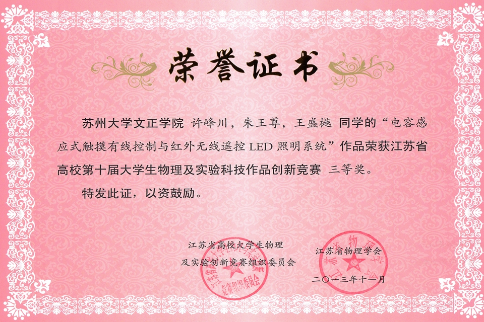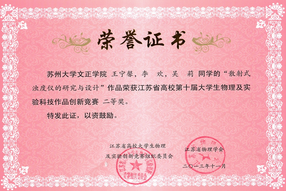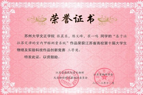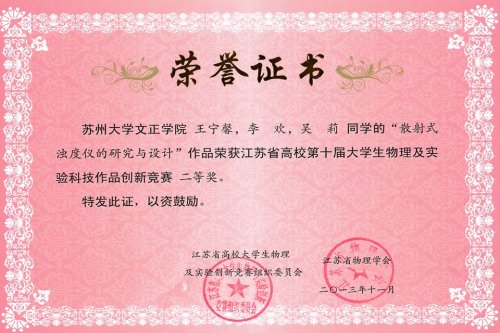 11月22日至24日在东南大学举行的江苏省高校第十届大学生物理及实验科技作品创新竞赛决赛中,全省共有42所高校的288个项目参加角逐,共评出一等奖25项,二等奖62项、三等奖110项,我院9名学生的3件实验制作类作品分别获得了1个二等奖和2个三等奖的好成绩。