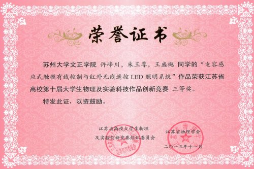 在11月23日东南大学决赛答辩现场,我院参赛学生分别将他们作品的设计思路向评审专家作了介绍,内容包括实验制作原理、作品的创新点及其应用推广价值等,并认真回答了专家的提问。最终,10电子王宁馨、10光信息李欢、10电子吴莉的《散射式浊度仪的研究与设计》以其独到的创意设计获得二等奖,11光信息许峰川、11光信息朱王尊、11光信息王盛樾的《电容感应式触摸有线控制与红外无线遥控LED照明系统》和10测控张晨东、10光信息陈义峰、10光信息崔一鸣的《基于法拉弟定律的室内甲醛测量系统》也以其实际的应用推广价值分别获得三等奖,从而继续保持了我院学生在此项赛事中比较稳定的好成绩。