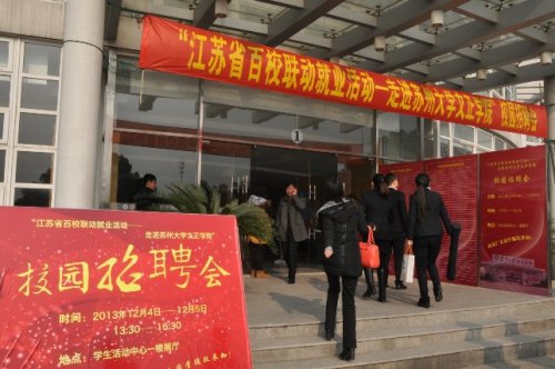(翠文报记者:陆晓芸/文)12月4日至5日下午,由我院就业处组织的“江苏省百校联动就业活动——走进苏州大学文正学院”校园招聘会在学生活动中心一楼大厅举办。参加本次招聘会的单位有158家,提供了诸如文员、前台、教师、设计师、出纳员、销售、技术人员等在内的岗位。参加招聘会的单位不局限于苏州市或江苏省,也有很多来自外省的单位。我院800多名2014届毕业生参加了本次招聘会。