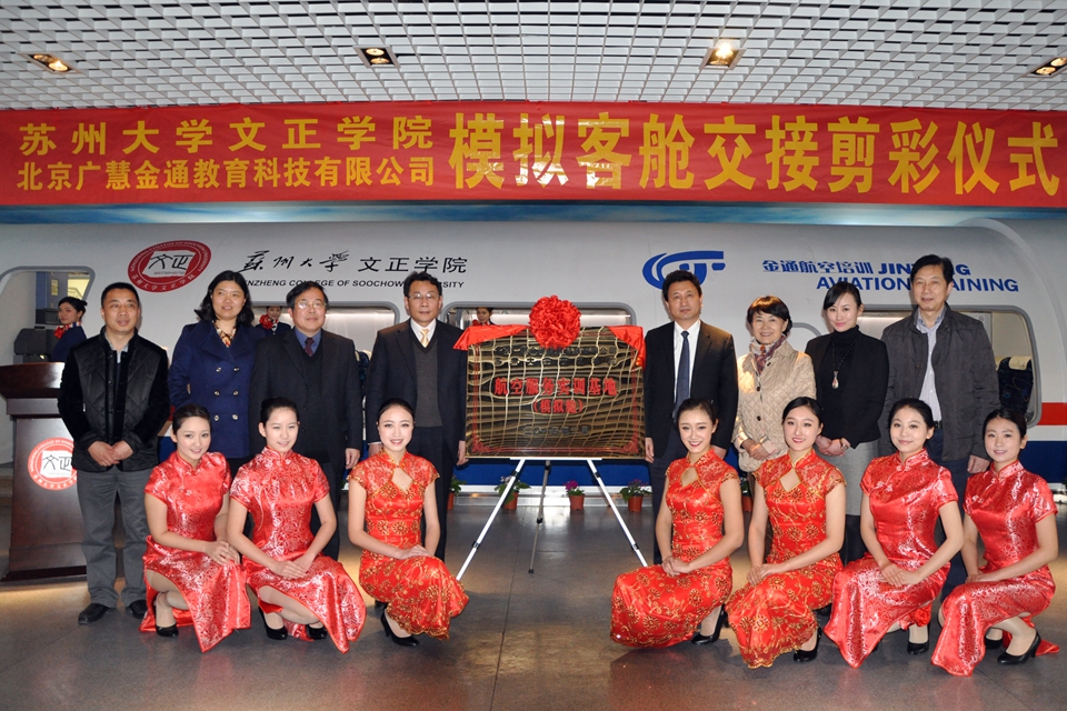翠文报讯(文/时冉 图/于汇洋)2月28日下午,我院与北京广慧金通教育科技有限公司模拟客舱交接剪彩仪式在艺术中心101教室举行。我院院长吴昌政、党委书记徐子良、副院长施盛威、院长助理袁昌兵与北京广慧金通教育科技有限公司董事长焦殿成等来宾共同出席了剪彩仪式并举行了讲座及座谈会。