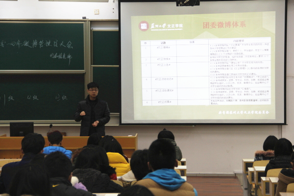 (姜舒蕾/文 姜舒蕾/图)2月26日下午5:20,我院团委信息部在教学楼2-101举办了2013年度腾讯微博总结大会暨2014年度团委微信公共平台推介会。2011级、2012级和2013级各班宣传委员与各系微博总负责人出席会议,会议由团委信息部指导老师魏秋江主持。