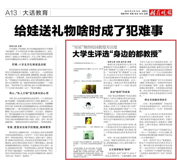 寻找“身边的都教授”活动由该院极具人气的学生媒体《翠文报》发起,在该报的人人网、新浪微博、腾讯微博、百度贴吧以及微信等网络平台同步推出,并用了当下很流行的“长图”形式,文案也是满满的“星味”——“大家怎么了,身边的小伙伴都疯狂地爱秀贤欧巴么?可是小伙伴们也要爱为我们传道授业解惑的真正的教授哦!你们心目中最喜欢的文正老师是哪一位呢?”