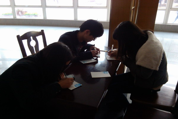 活动的顺利开展离不开系内各班委在班级里的宣传,英语、日语专业的小伙伴们积极配合。大赛期间共收到了288张明信片,参与率高达97%,书写的明信片更是融合了自身的专业特色,选择了各式各样的名言警句,让人耳目一新。更有小伙伴表示,因最近热播的韩剧《来自星星的你》,对韩语产生了一定的兴趣,将自己的第一次韩文秀献给了本次比赛。来自学院其他系别的明信片更是别具一格,除了英语、韩语,还有不少同学展示了自己在法语、俄语和阿拉伯语等方面的造诣。