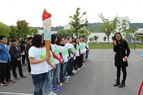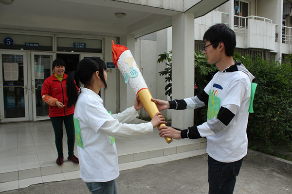 参加集约理念传递活动的共有15名火炬手,他们由学生代表和部分班级生活委员组成,每幢宿舍楼安排一名火炬手,火炬手接到火炬后,出发跑向下一幢楼,将手中的火炬交给下一名火炬手,并按序排在持火炬者后面跟跑。此外,每当火炬到达一幢宿舍楼时,该幢的宿管阿姨都会为火炬贴上水滴形状和灯泡形状的小卡片,传递“爱惜水电资源”之意。