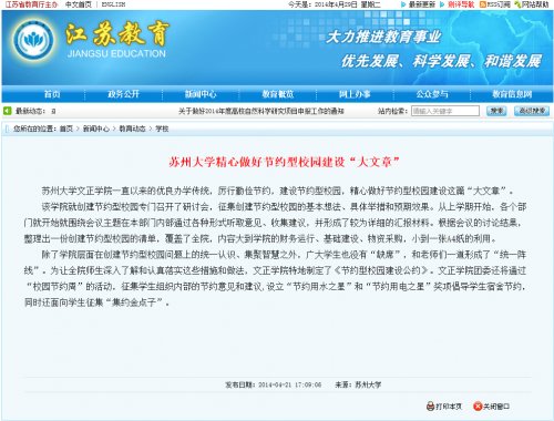 苏州大学文正学院一直以来坚持优良办学传统,厉行勤俭节约,建设节约型校园,精心做好节约型校园建设这篇“大文章”。