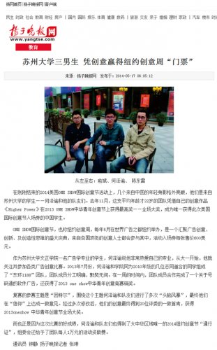 而也正是因为这次比赛的好成绩,何泽谕和队友们也得到了大中华区域唯一的2014纽约创意节“通行证”,组委会还给予了团队每人1万元的活动资助费。