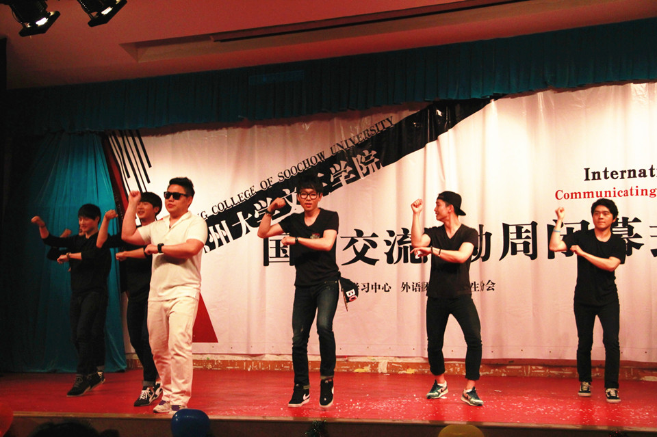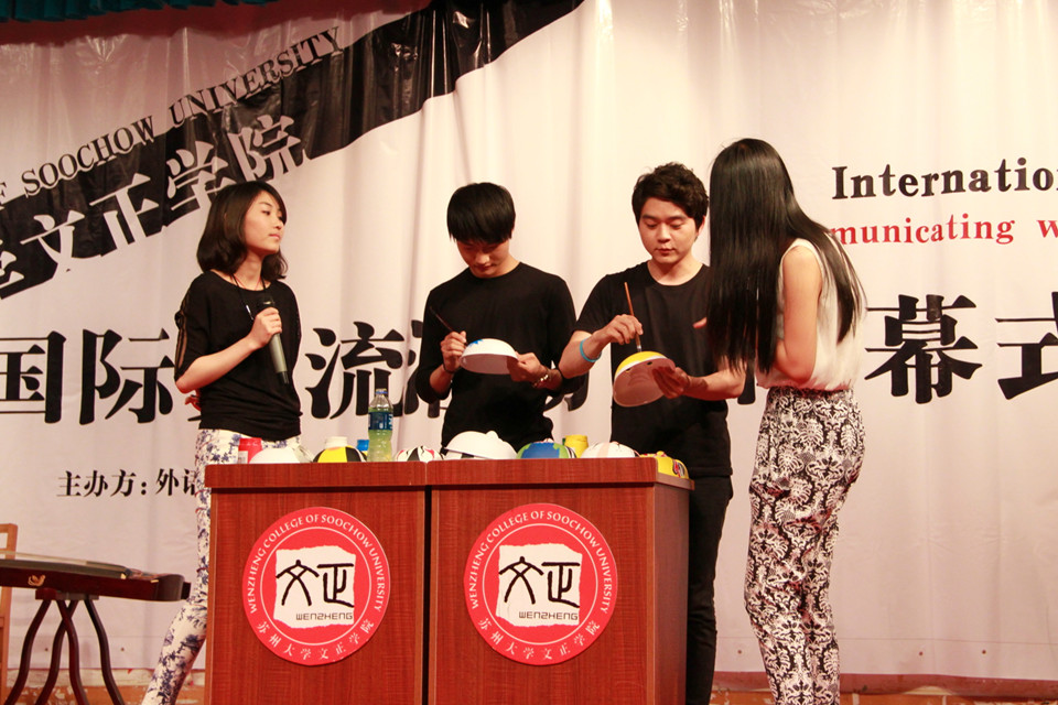 5月23日晚6点半,文艺晚会暨活动周闭幕式在学术报告厅举行,我院学生表演了歌舞、魔术、话剧、乐器、武术、走秀、Cosplay等节目。苏州大学独墅湖校区的韩国留学生也受邀来到晚会现场,他们带来了街舞串烧,并献上了大家熟知的骑马舞,使晚会气氛达到高潮。我院艺术系学生还现场手把手教留学生们制作京剧脸谱,栩栩如生的造型、浓浓的中国传统文化韵味深受喜爱。