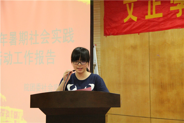 团委社会实践部部长过佳恋对2014年暑期社会实践组织工作作了报告。过佳恋回顾了我院社会实践部从方案征集到出征仪式过程中的各项工作,她指出,今年的暑期社会实践会一如既往地贯彻文正精神,为社会服务,为祖国的发展服务。仪式还邀请了去年暑期社会实践优秀代表吴一峰和今年暑期社会实践小分队代表张敏聪发言。他们分享了团队组建及确定课题的经历,从团队协作和个人能力的提升等方面讲述了暑期社会实践对自己的帮助。最后,他们对今年暑期社会实践活动的成功举办表达了美好的祝愿。