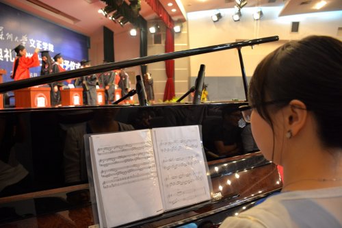 整场仪式沉浸在学有所成的毕业喜悦和真挚浓厚的校园情怀中。现场钢琴伴奏《启程》、《祝你一路顺风》等曲目,声声音符让人动容;学位授予导师合照,每一次快门记录着令人难忘的瞬间;全体师生合唱《毕业歌》,宣告着新一轮征程的扬帆起航。担任本次摄影任务的我院新闻中心同学沈嘉雯表示,“今日我们为学长学姐服务,明日学弟学妹们也同样会为我们送行”。也许,这就是一种精神的传承。
