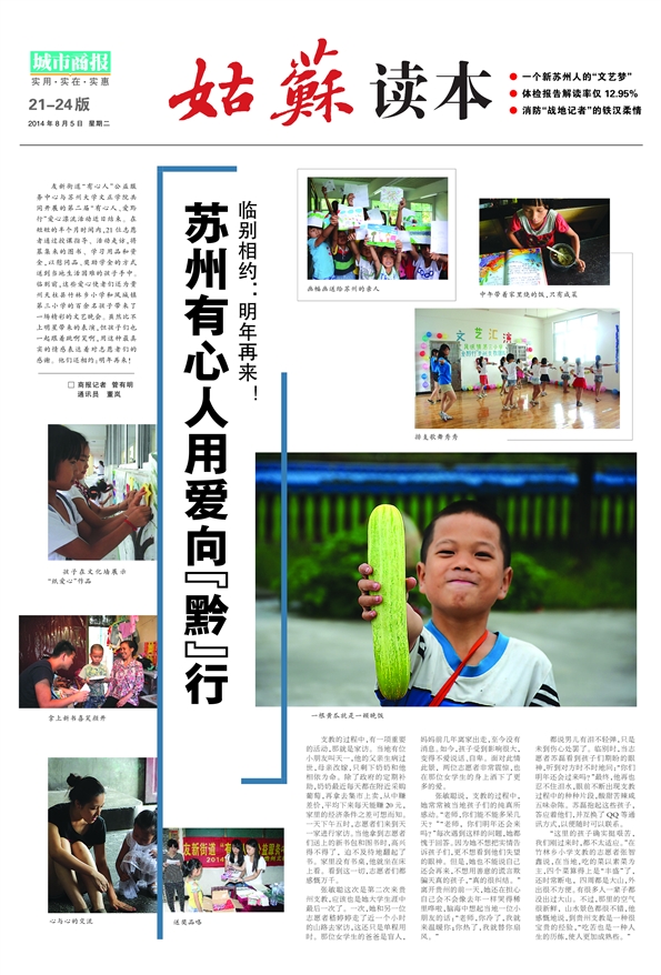 友新街道“有心人”公益服务中心与苏州大学文正学院共同开展的第二届“有心人、爱黔行”爱心漂流活动近日结束。在短短的半个月时间内,21位志愿者通过授课指导、活动走访,将募集来的图书、学习用品和资金,以慰问品、奖助学金的方式送到当地生活困难的孩子手中。临别前,这些爱心使者们还为贵州天柱县竹林乡小学和凤城镇第三小学的百余名孩子带来了一场精彩的文艺晚会。虽然比不上明星带来的表演,但孩子们也一起跟着跳啊笑啊,用这种最真实的情感表达着对志愿者们的感谢。他们还相约:明年再来!