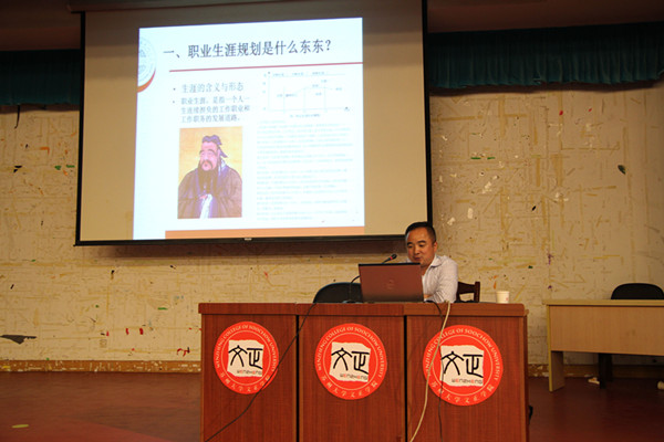 讲座从职业生涯规划是什么、大学新生要做好职业生涯规划、职业生涯规划的原则与要点、职业生涯规划的方法和职业生涯规划路线图五个板块展开。查佐明首先向在座的同学分享了一个小故事。故事围绕“十年之后你想干什么”这个问题讲述了主人公——当今的国际巨星周迅在十八岁迷茫之际如何在老师的引导下一步步做出自己的人生规划,进而在十年后功成名就的历程。生动的叙述方式和引人入胜的故事情节迅速吸引了学生的注意力,故事的最后,查佐明向现场同学提问:“你们十年后想变成什么样子?”场下陷入一片沉思。查佐明指出,职业是一个人的权利、义务和职责,是一个人社会地位的一般性表征,这也是大学生要做好职业生涯规划的最重要的原因之一。