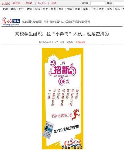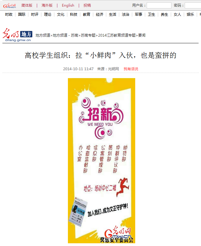 光明网苏州10月11日电(通讯员李蒙 记者李锦)近日,不管是走在校园里还是打开百度贴吧、人人网、腾讯微博等社交平台,苏州大学文正学院的新生们都能嗅到一股浓浓的火药味,该学院的各大学生组织为了“拉人入伙”,想尽了各种办法,也是蛮拼的。